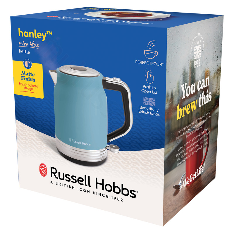 Rychlovarná konvice Hanley Retro Blue Russell Hobbs 28641-70 v matném modrém provedení nadchne milovníky tradičního stylu. Dokonalá kombinace designu a výkonu ozdobí každou kuchyň. Je jednoduchá, stylová a zároveň nabídne i praktické funkce.